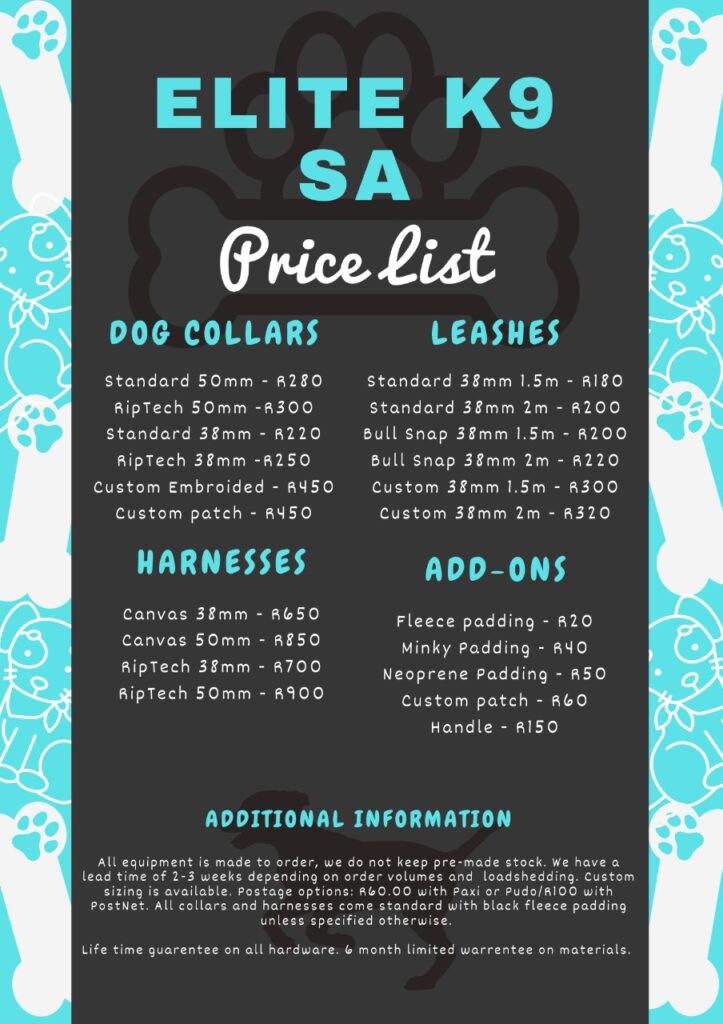 All equipment is made to order, we do not keep pre-made stock. We have a lead time of 2-3 weeks depending on order volumes and loadshedding. Custom sizing is available. Postage Options: R60-00 with Paxi or Pudo / R100-00 with Postnet. All collars and harnesses come standard with black fleece padding unless specified otherwise.